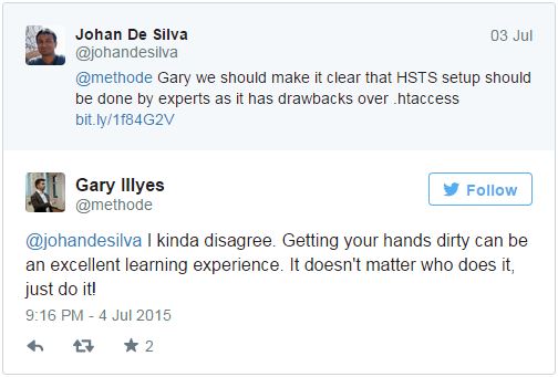 Gary Illyes, a Google Webmaster Trends elemzője még a mostanában aktuális HTTPS kapcsolatra való átállásnál is javasolja, hogy akár a weboldal tulajdonos maga végezze el a szükséges beállításokat.