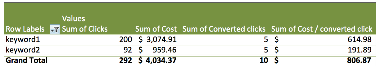 Mindkét kulcsszó eredményezett konverziót, de $614 és $191 volt a CPA, amelyek meghaladják a konverziókhoz szükséges költségeket.