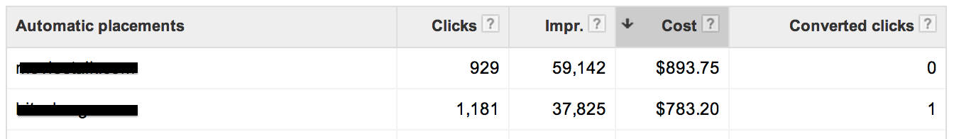 Futtassunk le egy „Elhelyezések” jelentést és zárjunk ki minden olyan célzást, amely a magas költés ellenére nem eredményezett konverziót. Ezzel egyidejűleg, nézzük át azokat a kulcsszavakat és oldalakat, amelyek magas költséggel ugyan, de célteljesülést hajtottak végre.