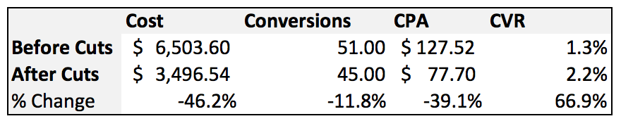 A felesleges költések csökkentésével, és a napi költségkeretek átcsoportosításával a fiók konverziós rátája nagymértékben javult, de pozitív változás történt a CPA értékekben és további költségekben is. Minimális konverziós szám elveszítésével ilyenkor számolni kell, de ez elenyésző a költségek csökkenéséhez képest.